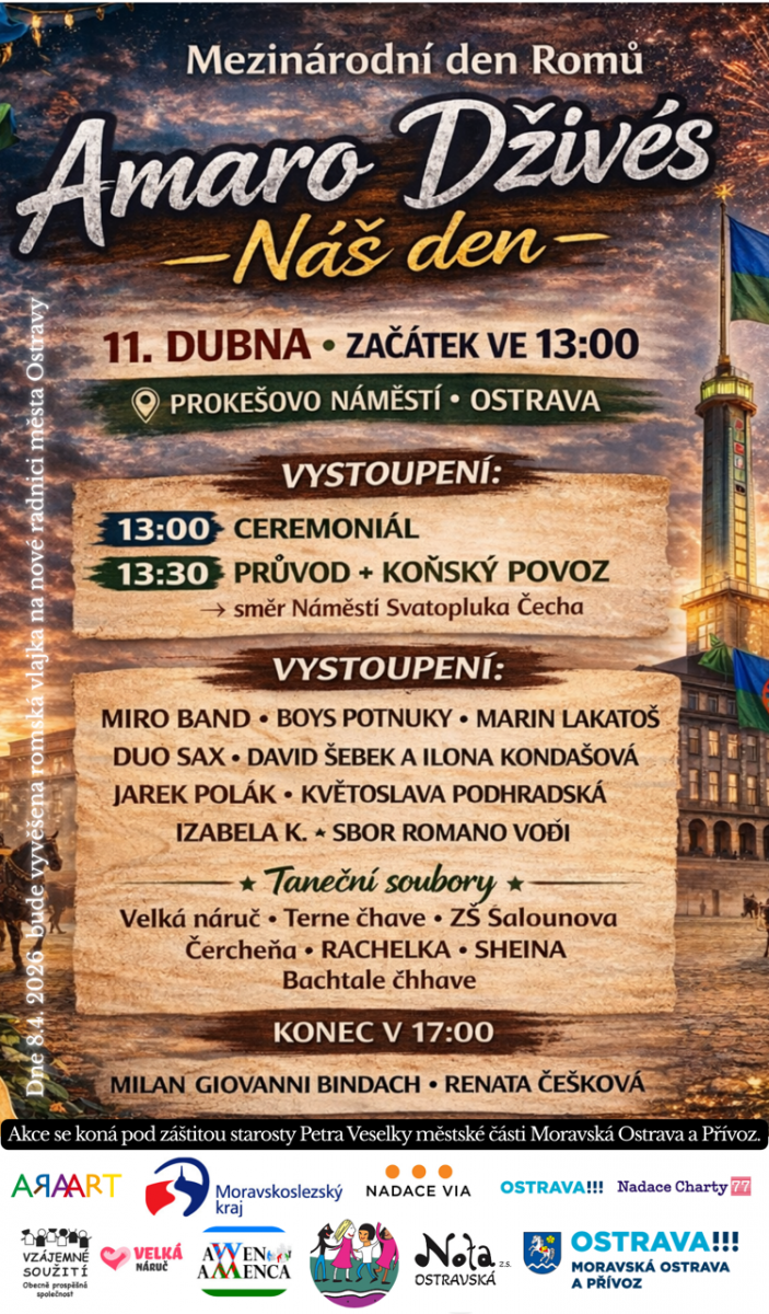 V sobotu 11. 4. 2026 se uskutečnila v Ostravě veřejná kulturní akce, k Mezinárodnímu dni Romů, kterou jsme nazvali AMARO ĎIVES. Na přípravě a realizaci akce spolupracovalo několik nestátních neziskových organizací z Ostravy a blízkého okolí, které dlouhodobě pracují s lidmi z romské komunity, kteří žijí v různých městských částech Ostravy: