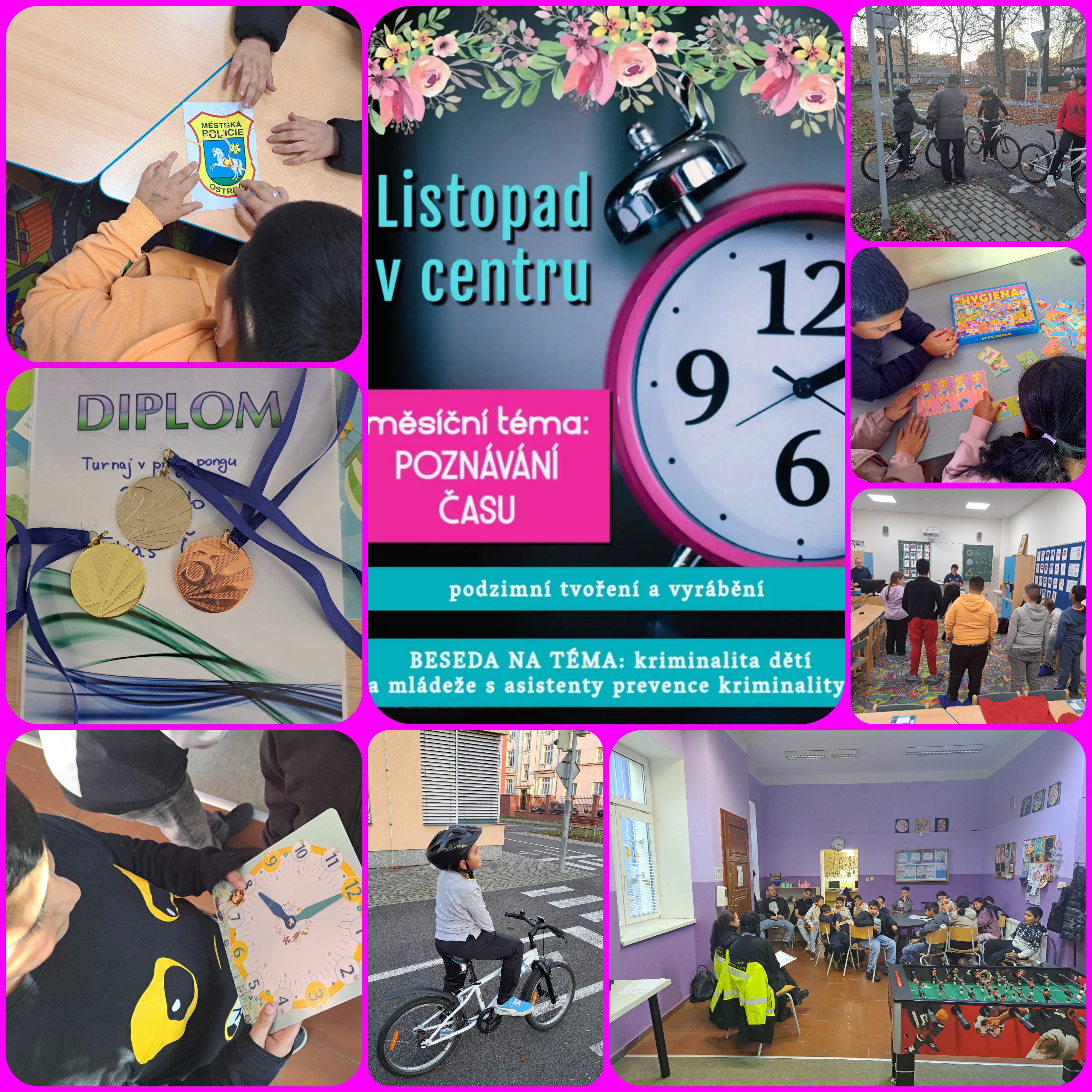 Tématem měsíce listopadu bylo poznávání času. Děti se učily orientovat v čase – poznávat hodiny, vyjmenovat měsíce v roce, uvést aktuální rok nebo si připomenout datum svého narození. Všechny aktivity probíhaly hravou formou rozhovorů a soutěží, během nichž měly děti možnost za podpory pracovníků rozvíjet a upevňovat uvedené dovednosti.