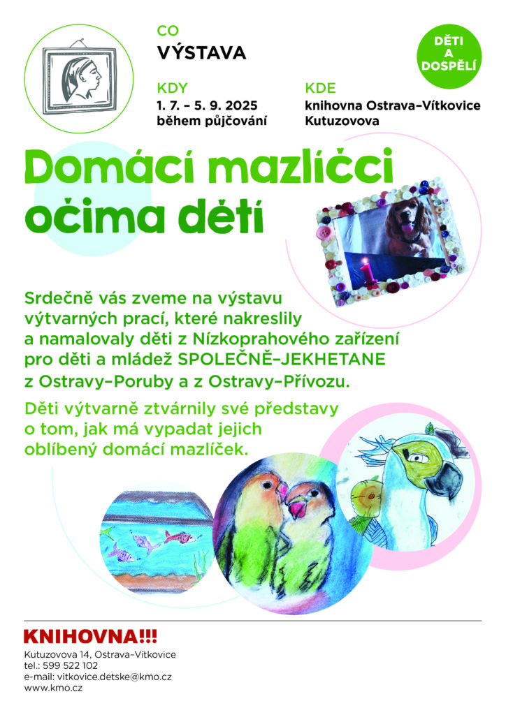 Rádi bychom vás pozvali na výstavu výtvarných prací dětí z našich Nízkoprahových zařízení pro dětí a mládež SPOLEČNĚ-JEKHETANE, která bude probíhat po celý červen a červenec v knihovně města Ostravy, pobočka Vítkovice.